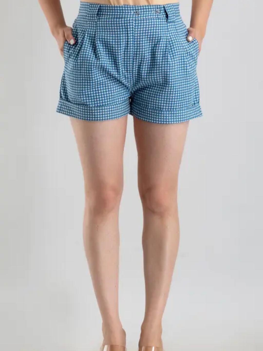 Bring playful charm to your summer wardrobe with these Blue Gingham Checkered Shorts. Crafted in a flattering high-waist design with soft pleats, these shorts offer the perfect blend of retro style and modern comfort. The crisp check print and roll-up hems make them ideal for both everyday outings and holiday looks.