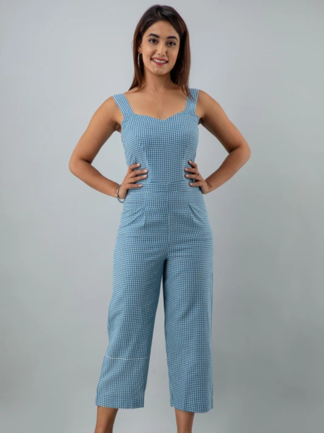 Add a fun twist to your wardrobe with this Blue Gingham Sleeveless Jumpsuit. Designed with a sweetheart neckline and wide shoulder straps, it offers a flattering fit with a playful vibe. The checkered pattern gives it a classic yet trendy feel, while the cropped culotte-style pants provide all-day comfort and movement. Ideal for brunches, vacations, or casual days out—this one-piece outfit makes styling effortless!