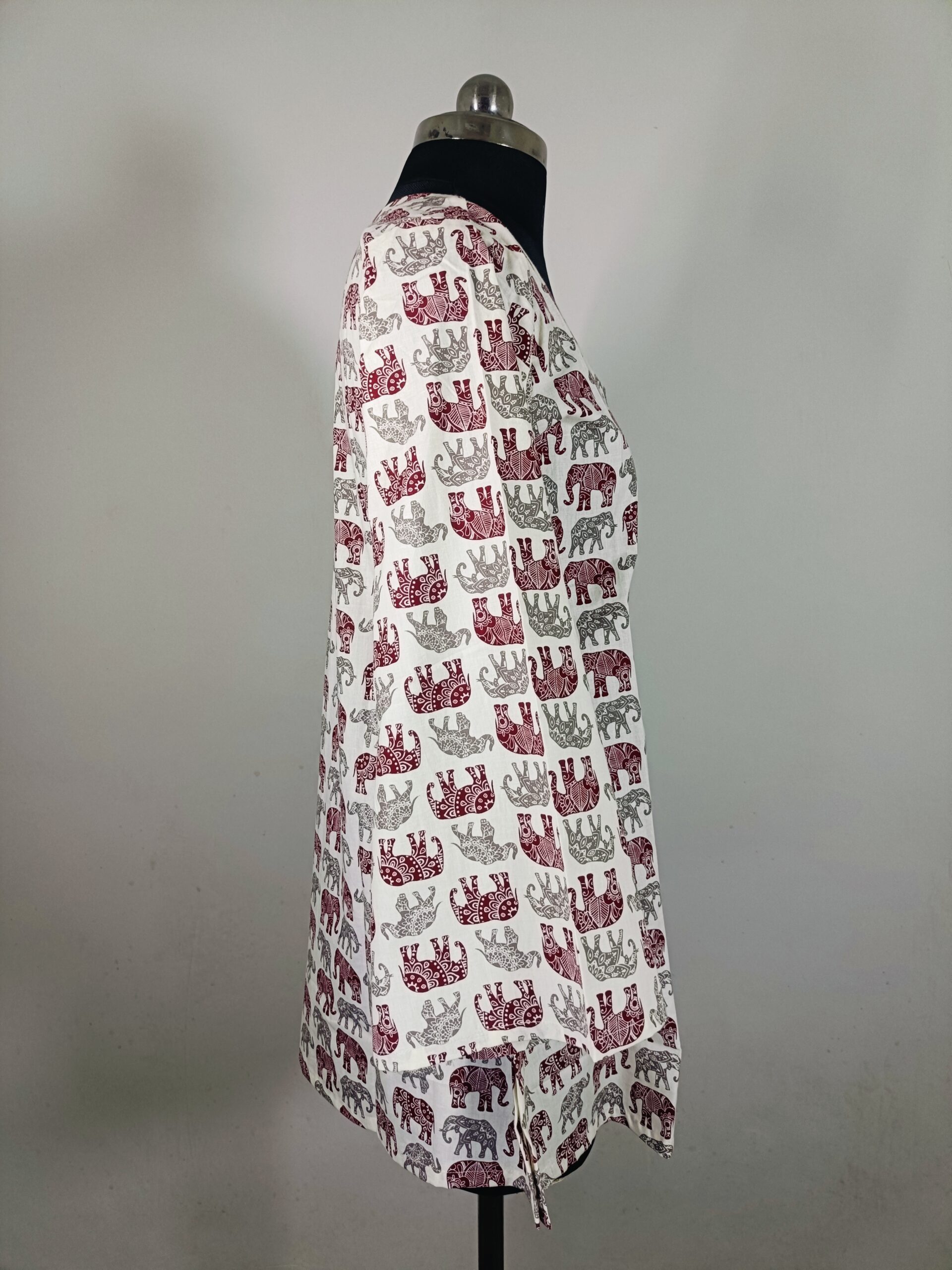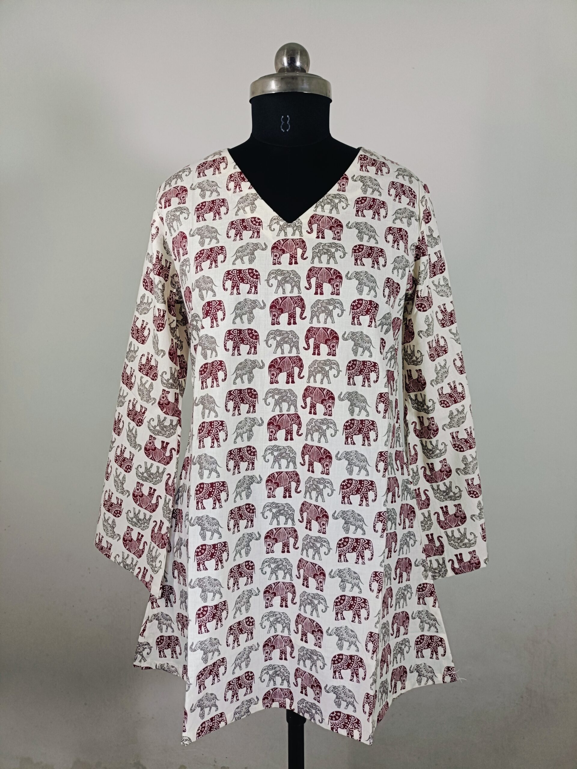 Step into comfort and charm with our handcrafted A-Line kurti featuring a stunning all-over elephant print in elegant maroon and grey shades. Made from breathable cotton, this kurti offers a relaxed silhouette, perfect for casual outings or festive daytime wear. The V-neckline and full sleeves add a touch of sophistication, making it a must-have for every ethnic wardrobe.