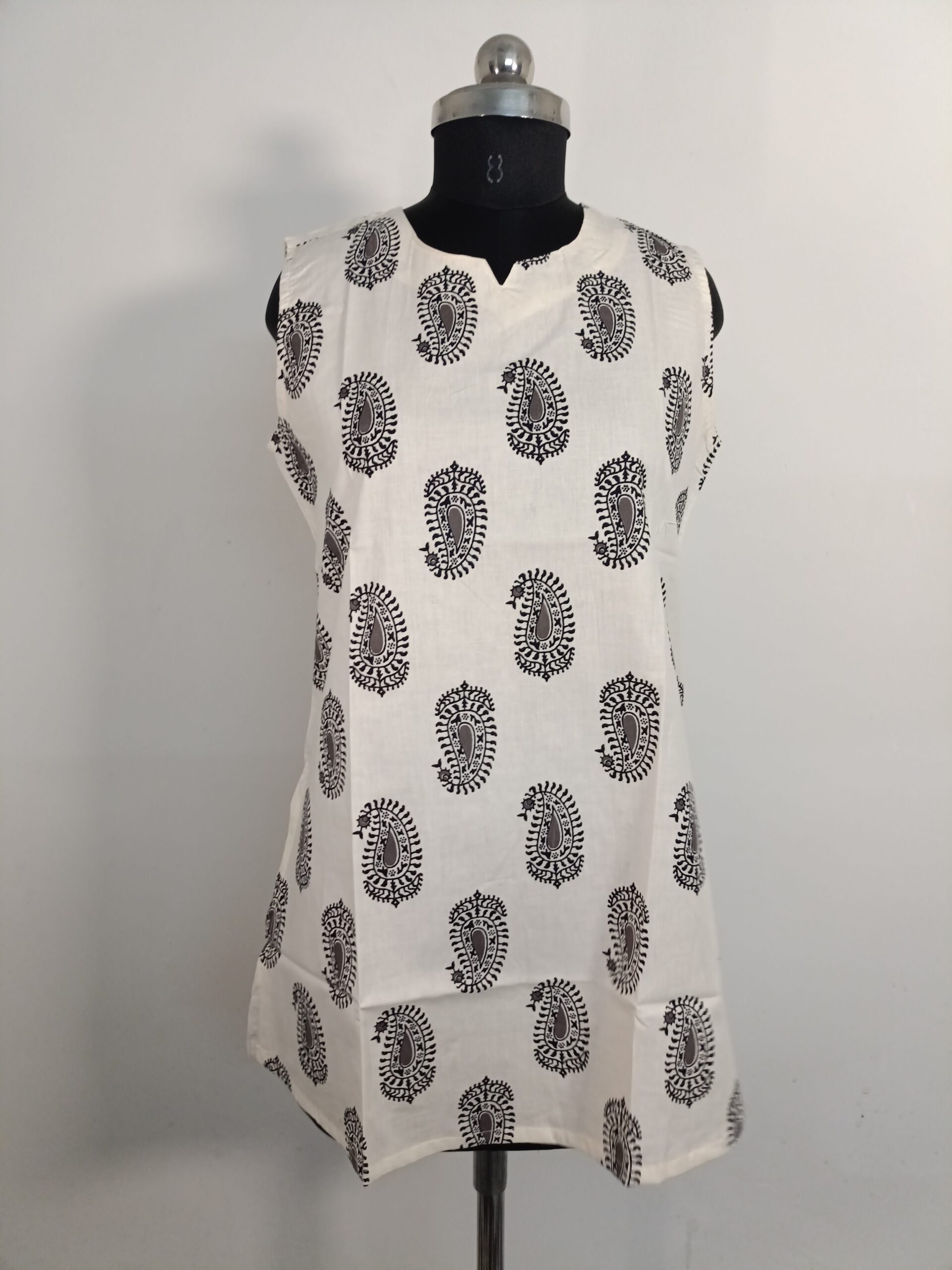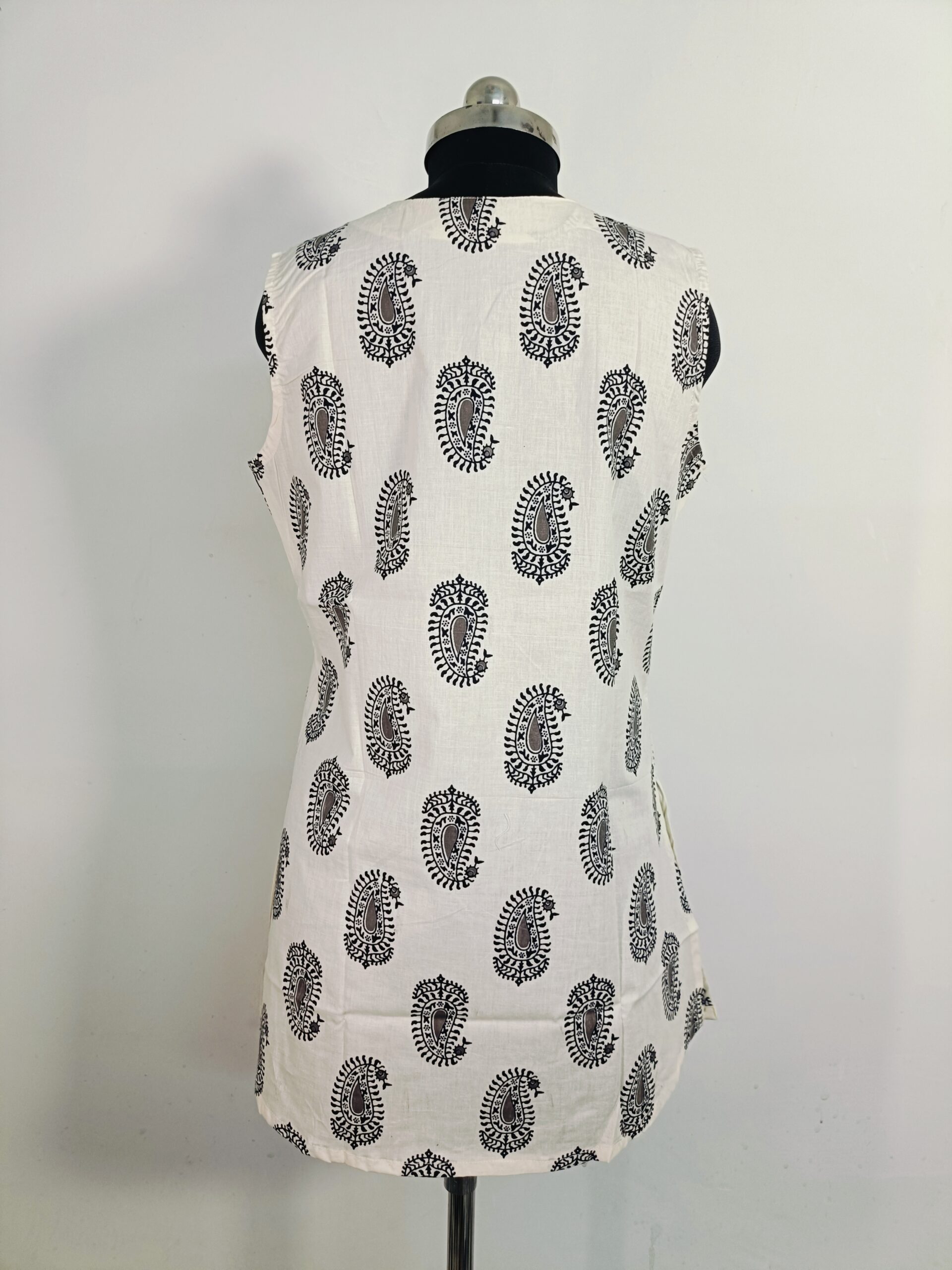 Step into timeless elegance with this white cotton kurti from Rangkari, adorned with beautiful black handblock paisley prints. Crafted in breathable cotton fabric, this sleeveless kurti is perfect for both daily wear and casual outings. The stylish neckline and handcrafted detailing reflect traditional charm with modern simplicity.