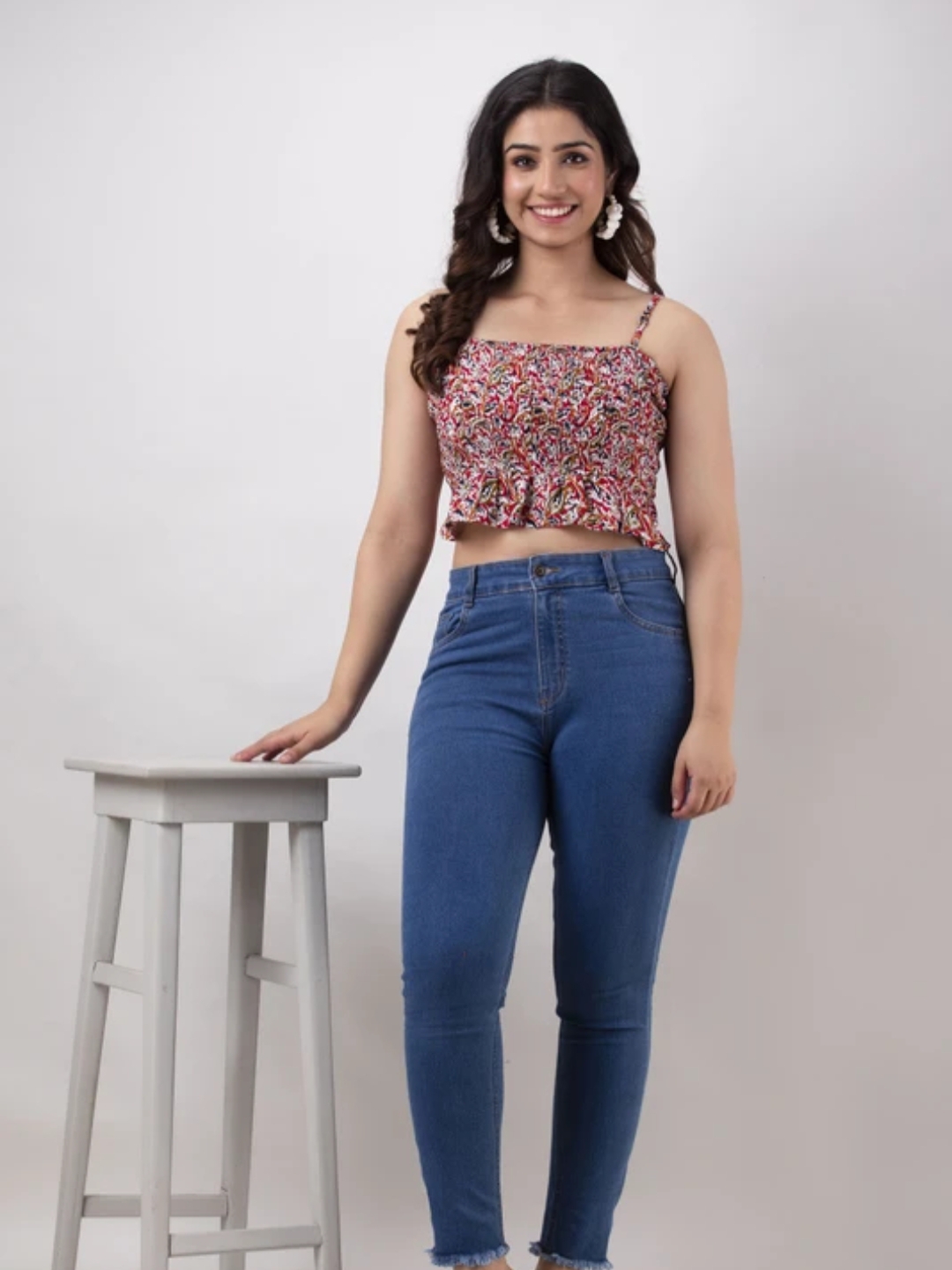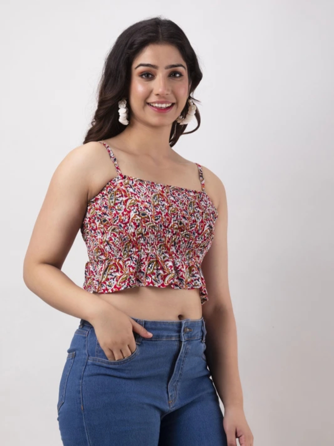 Bring a burst of color to your wardrobe with this smocked multicolor crop top by Rangkari. Featuring a vibrant ethnic print, stretchable bodice, and cute ruffle hem, it’s designed to keep you cool and chic. Perfect for summer outings, vacations, or casual coffee dates.