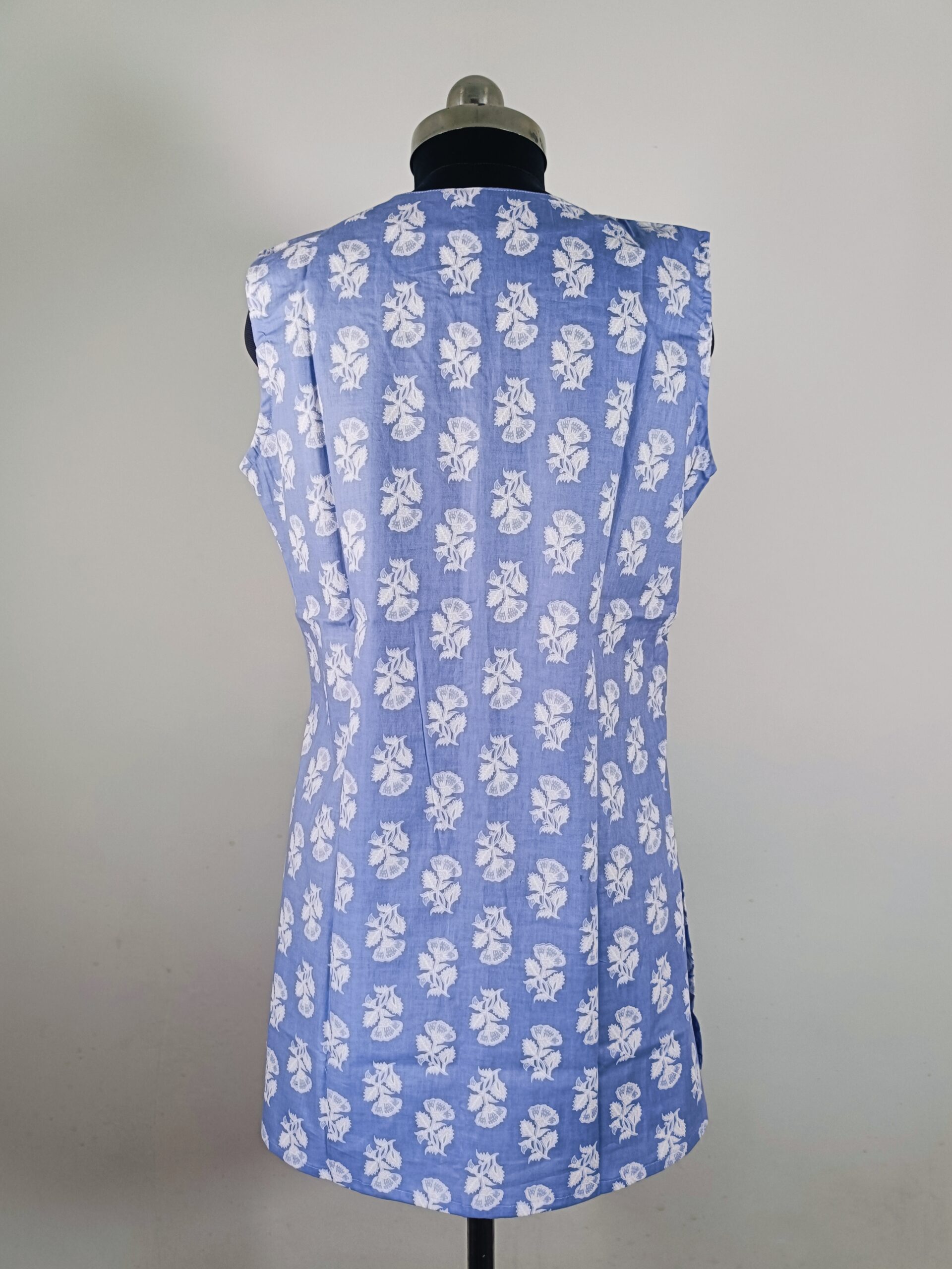 Add a refreshing touch to your wardrobe with this elegant lavender sleeveless kurti by Rangkari. Crafted from breathable cotton fabric, it features delicate white floral handblock prints and a stylish V-cut round neckline. Designed for everyday comfort with a flattering straight fit, it’s perfect for casual outings, work-from-home looks, or summer days.