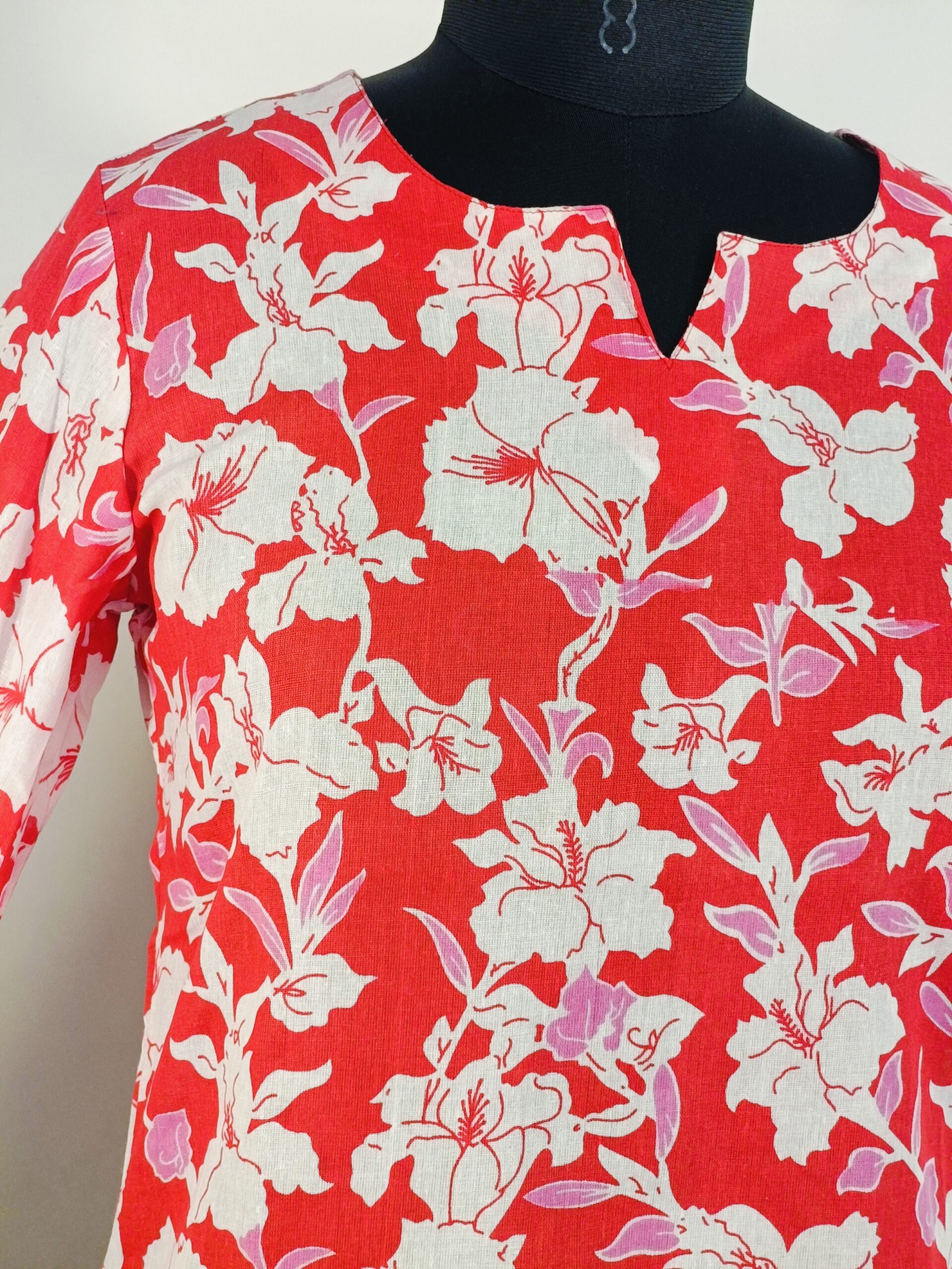 Be the first to review “Red Floral Straight Kurti with Notch Neck and 3/4 Sleeves”