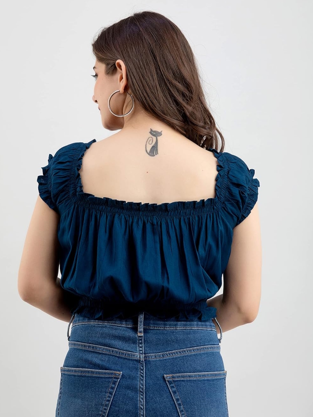 Turn up the charm in this Teal Blue Ruched Crop Top that blends playful texture with effortless flair. Designed with soft gathers and feminine ruffles, this top adds instant drama to your everyday or weekend style. The elasticized hem and sleeves offer a snug yet comfy fit that moves with you.