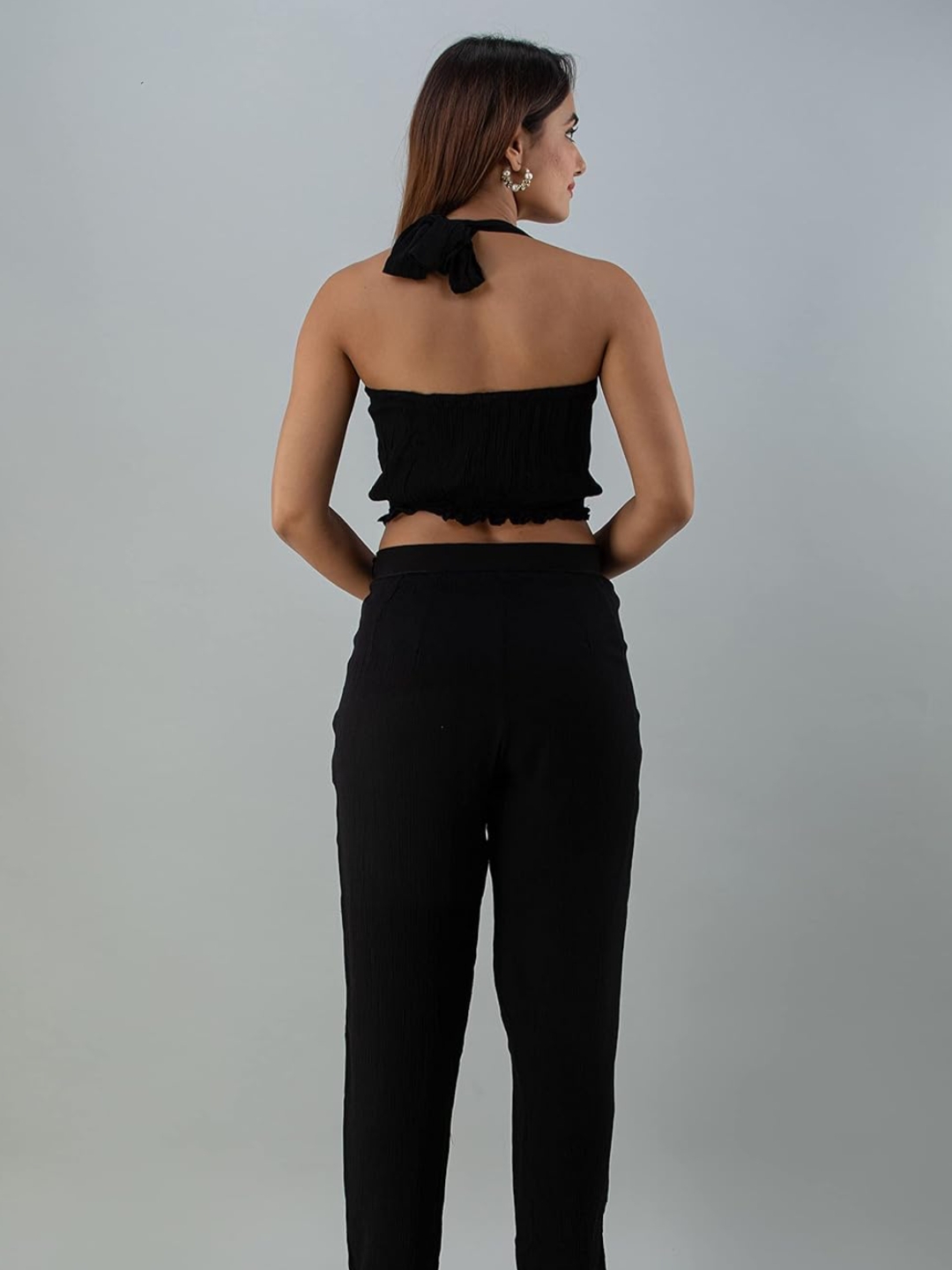Turn heads in this effortlessly stylish black co-ord set from Alot by Rangkari. Featuring a chic sleeveless crop top with a V-neck and matching high-waist tapered pants, this set offers a flattering fit with lightweight comfort. Whether it’s a day out or a casual evening event, this co-ord is your go-to for instant glam.